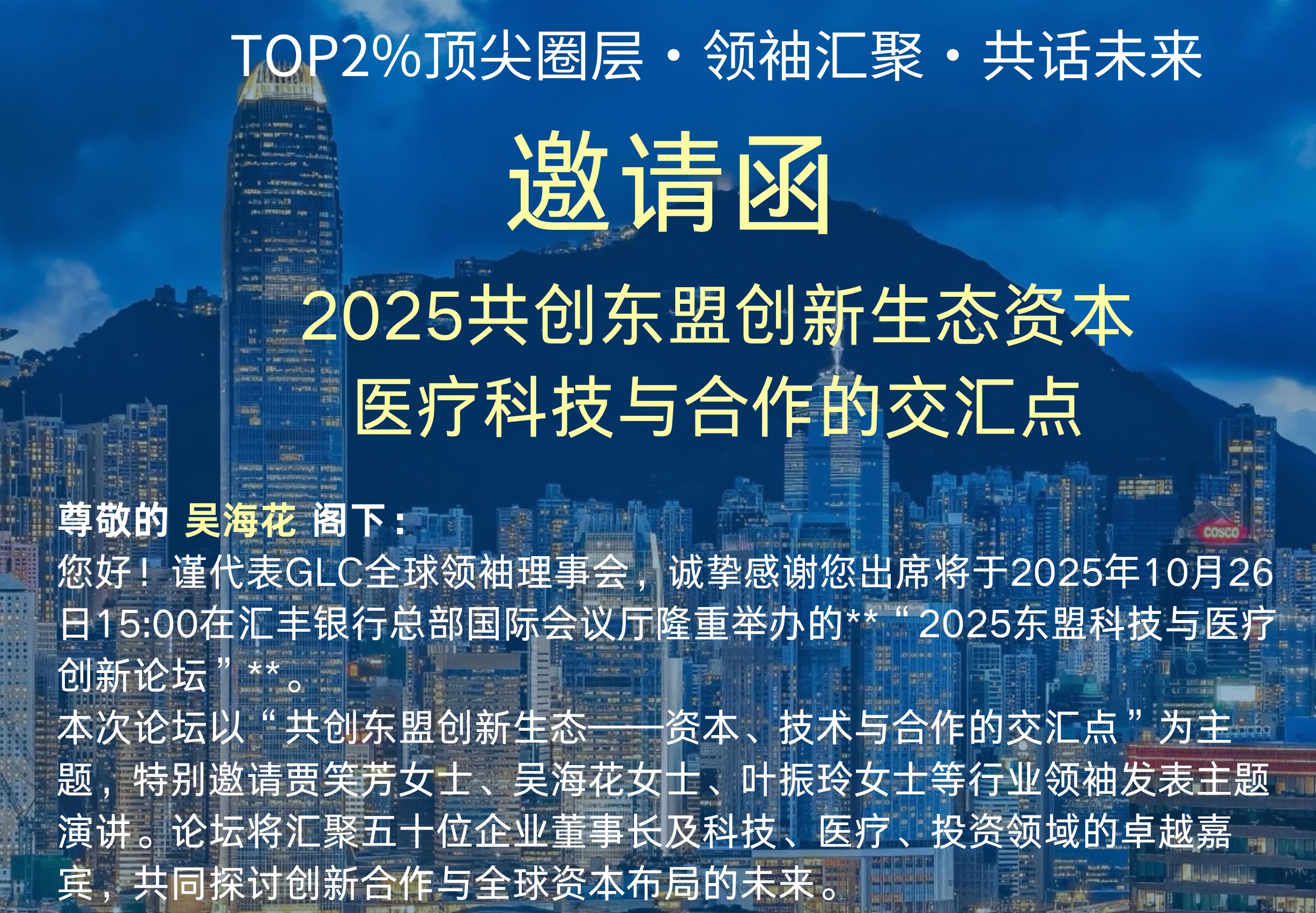 备受瞩目的“共创东盟创新生态——资本、技术与医疗”论坛即将于10月26日在五星级商务会所隆重举行。华表生态资源交易平台董事长吴海花已确认出席并发表主旨演讲,与行业领袖共探东盟地区医疗科技与产业创新的融合发展路径。